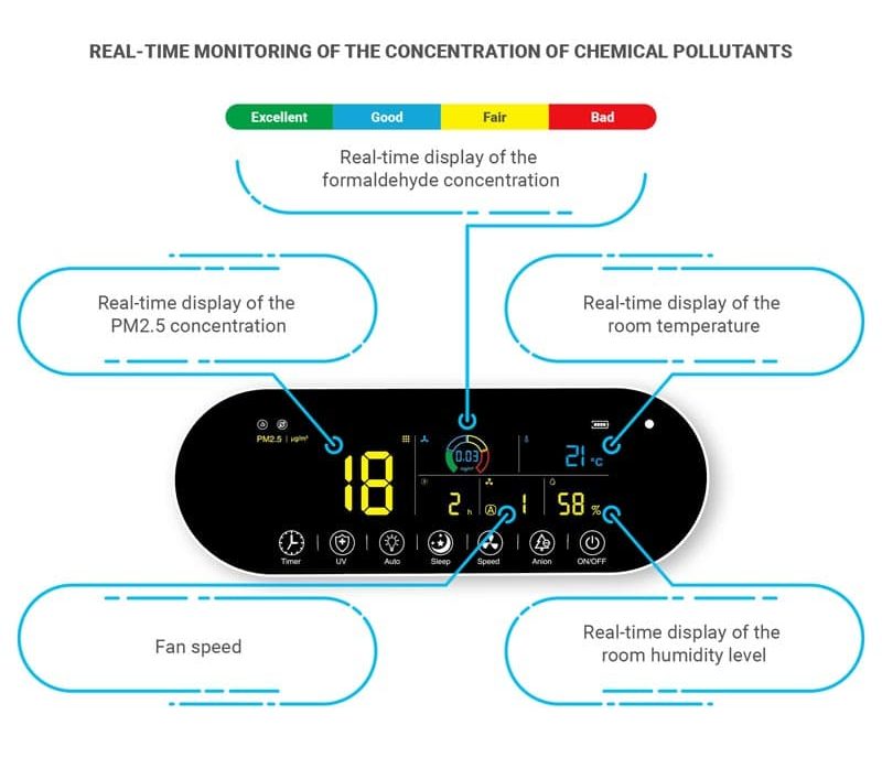 (formaldehyde concentration). Its pollution sensors analyze the ambient air accurately and regularly.