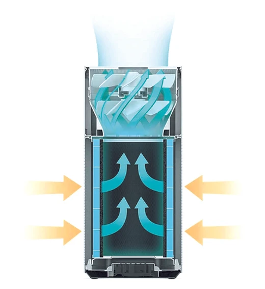 La proiezione verticale dell’aria verso il soffitto della stanza garantisce una ridistribuzione ottimale. Questo ingegnoso sistema di miscelazione è progettato per una maggiore efficienza: più efficiente è la circolazione dell’aria, più veloce e completa può essere trattata.