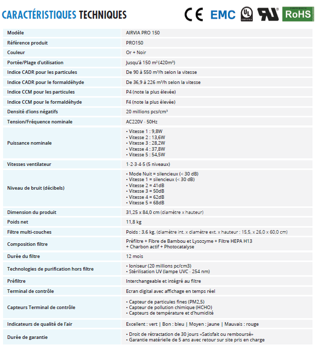 Il purificatore Airvia Pro 150 della gamma medicale AIRVIA è un purificatore d’aria ad alte prestazioni in grado di trattare ambienti fino a 150 m². Grazie al filtro più ampio e alla potenza eccezionale , è in grado di purificare l’aria dei vostri locali in modo rapido ed efficiente. Completamente silenzioso alla velocità 1, sa essere discreto. I saloni di parrucchieri, con la loro aria satura di capelli e peli, trarranno vantaggio dal suo prefiltro intercambiabile che riduce notevolmente i costi di manutenzione. Non è necessario sostituire l’intero filtro per ripristinare le normali prestazioni del purificatore. Il suo design si ispira al mondo aeronautico e le sue tecnologie di filtrazione derivano dal mondo medicale. È stato progettato per soddisfare le esigenze di professionisti e privati.